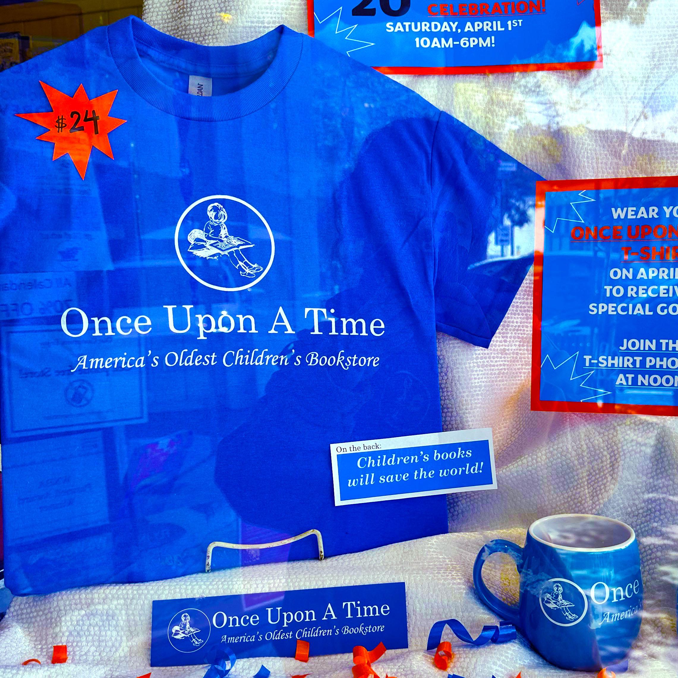 America's Oldest Children's Bookstore believes that "Children's Books Will Save the World"! Show your Once Upon A Time pride and love of children's literature all in one bright blue shirt.